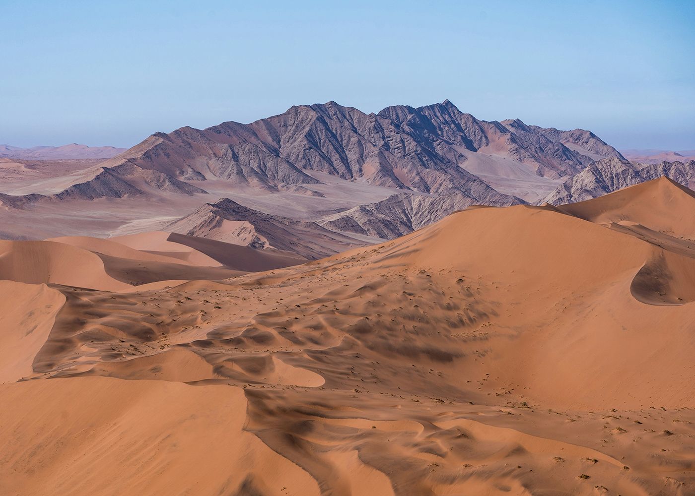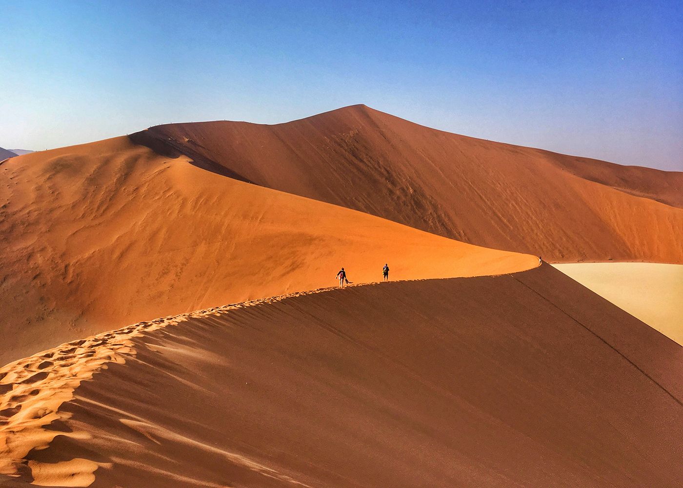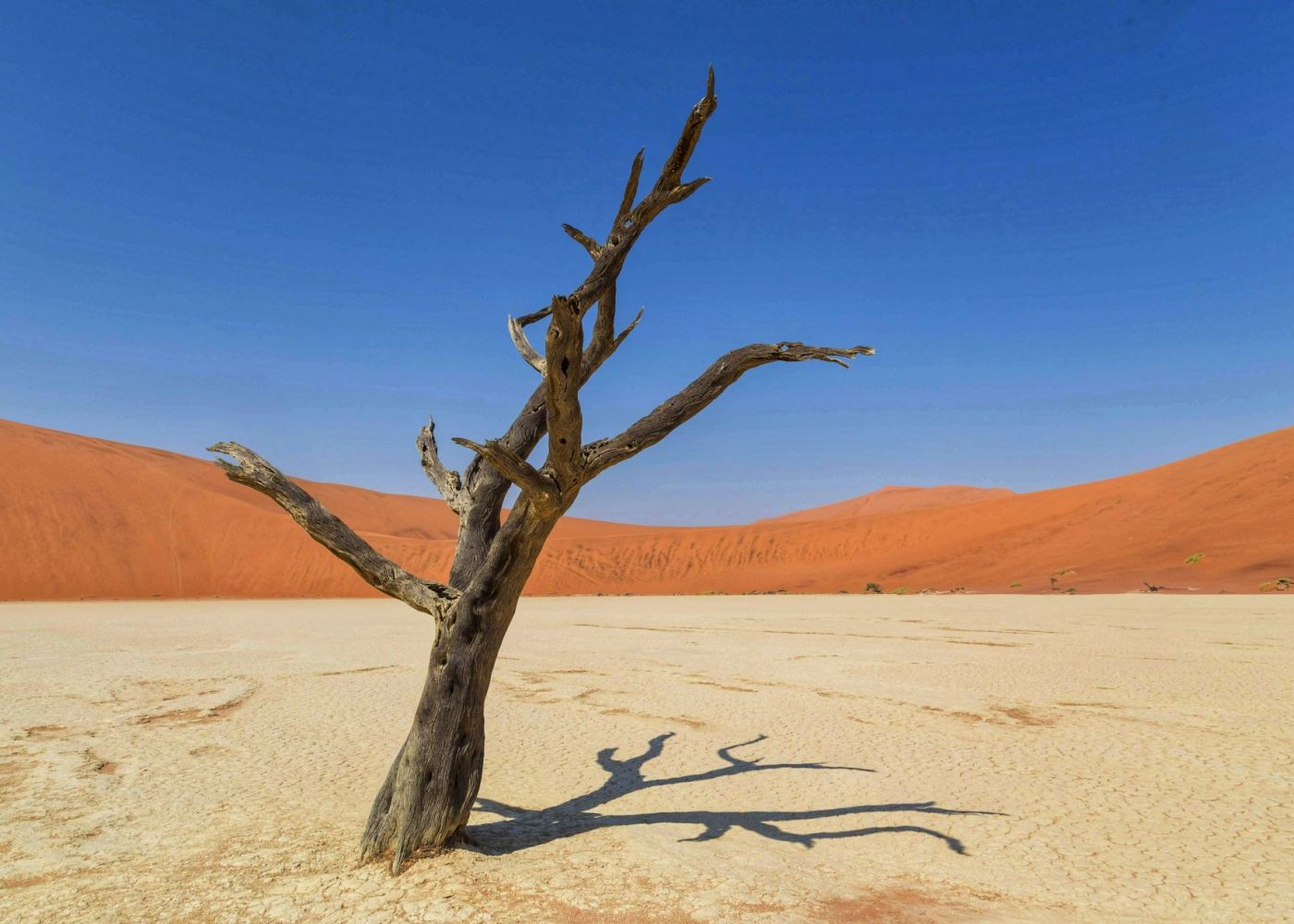 Partenza prima dell’alba! Bisogna entrare presto nel parco del Namib per godere della luce migliore che disegna le ombre sulle dune. Non solo la celebre Duna 45 ma tutte le altre regalano scenari stupendi a fotografi e appassionati. A seguire affrontiamo un breve tratto di sabbia morbida con i nostri 4x4 per raggiungere il parcheggio da cui iniziamo un trekking spettacolare fino alla vetta della “Big Daddy” la duna più alta di tutte (390 metri, qualcuno dice sia la più alta del mondo). Si trova in una zona di dune altissime, non lontano dalla Duna 9 (350 metri) e dalla Big Mama (300 metri) ma soprattutto è adiacente al Deadvlei, il letto di un fiume secco in cui sono presenti i tronchi di diversi alberi di acacia ormai morti dopo che il fiume ha cambiato il suo corso. I tronchi scuri degli alberi sono una delle icone della Namibia.