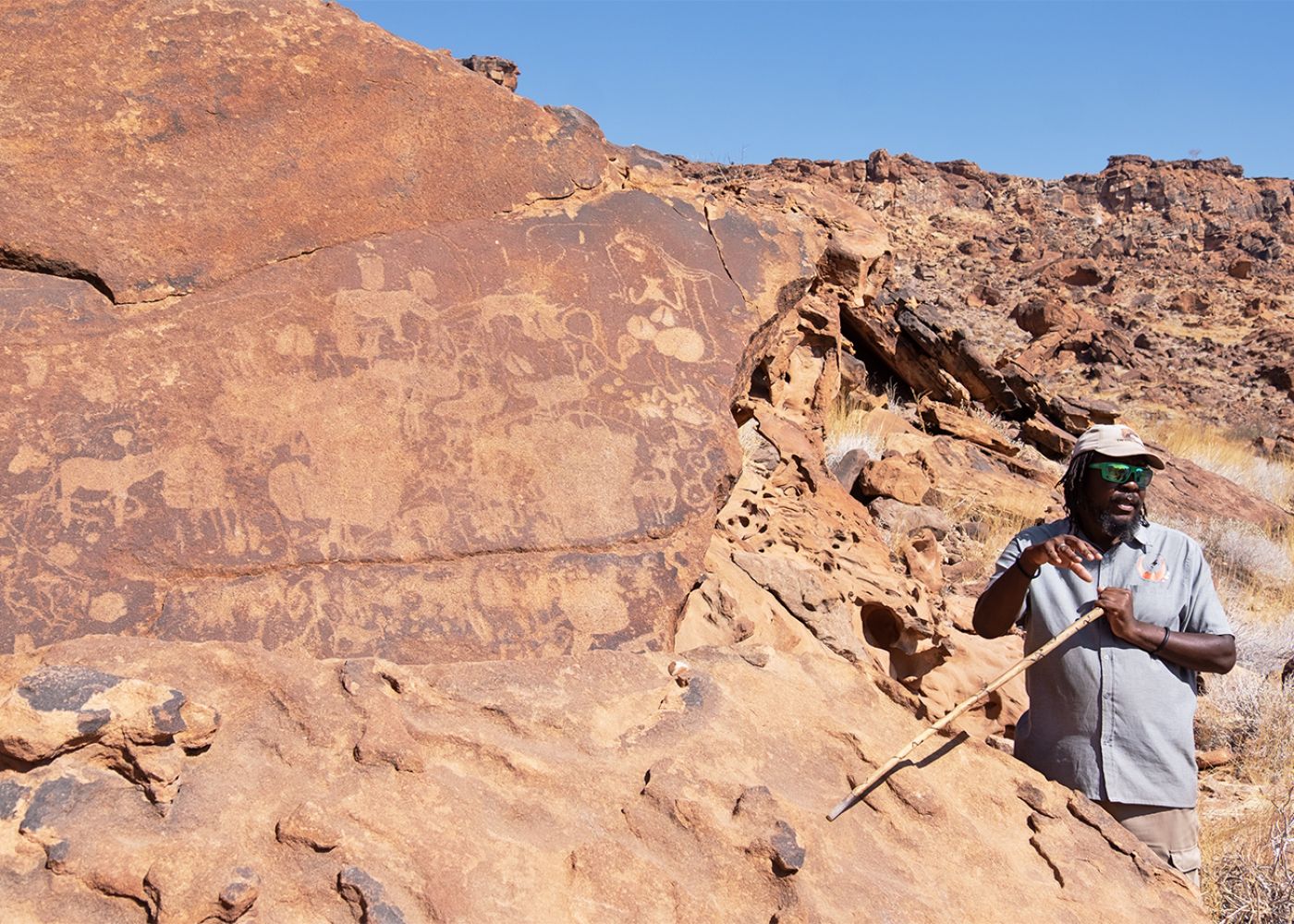 A seguire raggiungiamo Twyfelfontein, il luogo più noto per l’arte rupestre. Migliaia di dipinti rupestri e graffiti sono stati ritrovati in quest’area, testimonianza di popolazioni vissute qui migliaia di anni fa.